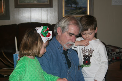Christmas morning was wonderful. The kids actually slept in until 7:30 (yes, that is sleeping in) and we opened Santa's gifts along with a few others and then the hunting began. Santa brought a hunting game on the Wii.. I looked up it was 9:15 and we were suppose to be at the Doss house at 9:30.. we were all still in P.J.s (which explains why we look so cute on Christmas Day!) We enjoyed our time over there with more generous gifts, wonderful meal by Nini, and good old family time. It is so normal for everyone to gather around the piano, drums, baskets of shakers, symbols, whatever instrument that makes lots of noise and sing. It really is like the scene from My Best Friends wedding.. the kids love it. Especially EJ, she loves the music and loves to dance. Wyatt is a little more reserved but loves the attention. I am the only one who in tone deaf, does not have an ounce of rhythm, and cannot even move my two feet in the same direction without thinking so hard about I fall over. I pray the kids take after Zach and the entire Doss Family. Skeet and Nini started a new tradition this year of the Happy Birthday Jesus cake on Christmas Day, so the kids loved that. I hope they really understand the next few years the true meaning of all this fun and how extremely blessed we are.